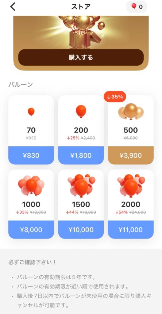 「マウム」には課金制度があり、大きくわけてバルーンとチケットがあります。