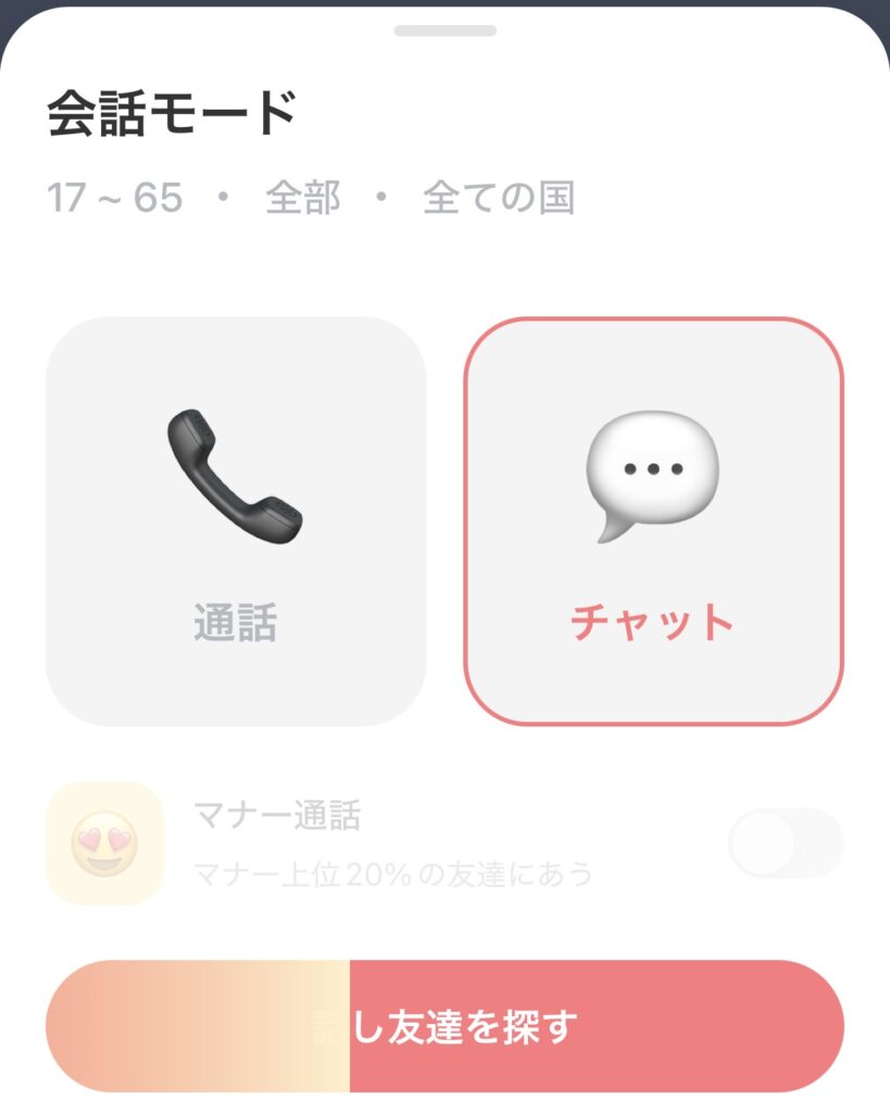 マッチングの仕方は通話のときと同じで、相手を探す際に通話ではなく、隣にあるチャットを選択することで相手を探すことができます。