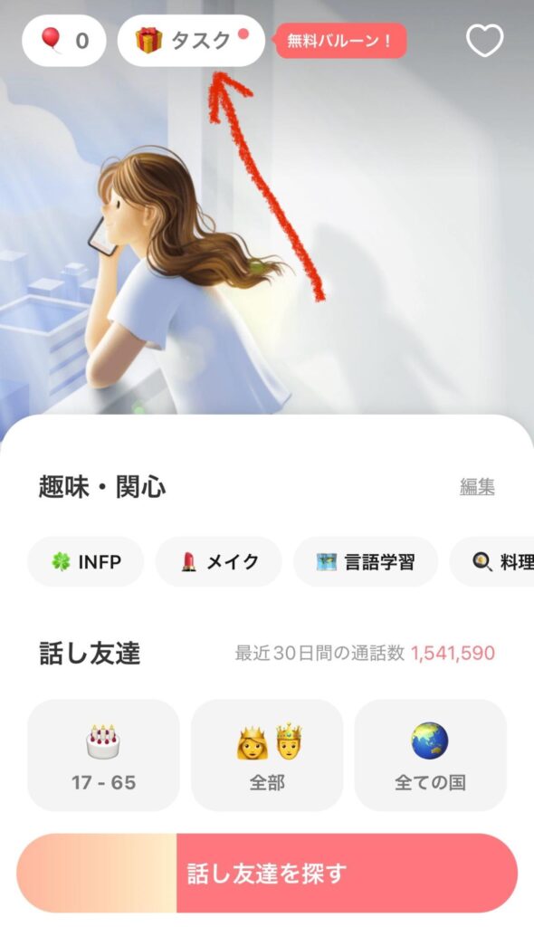 そこをタップすると、「デイリータスク」が表示され、1日1回広告を再生するとバルーンがゲットできます。