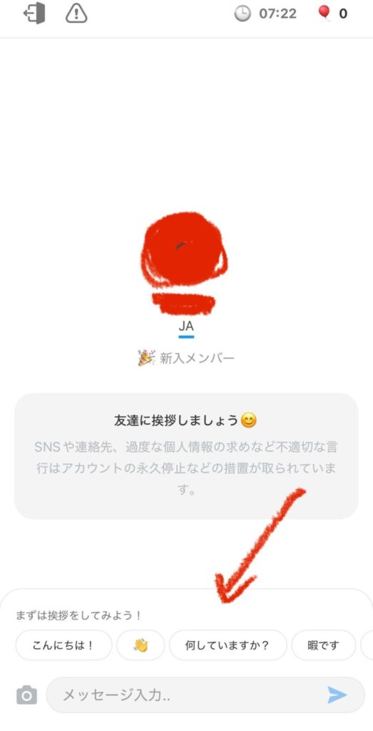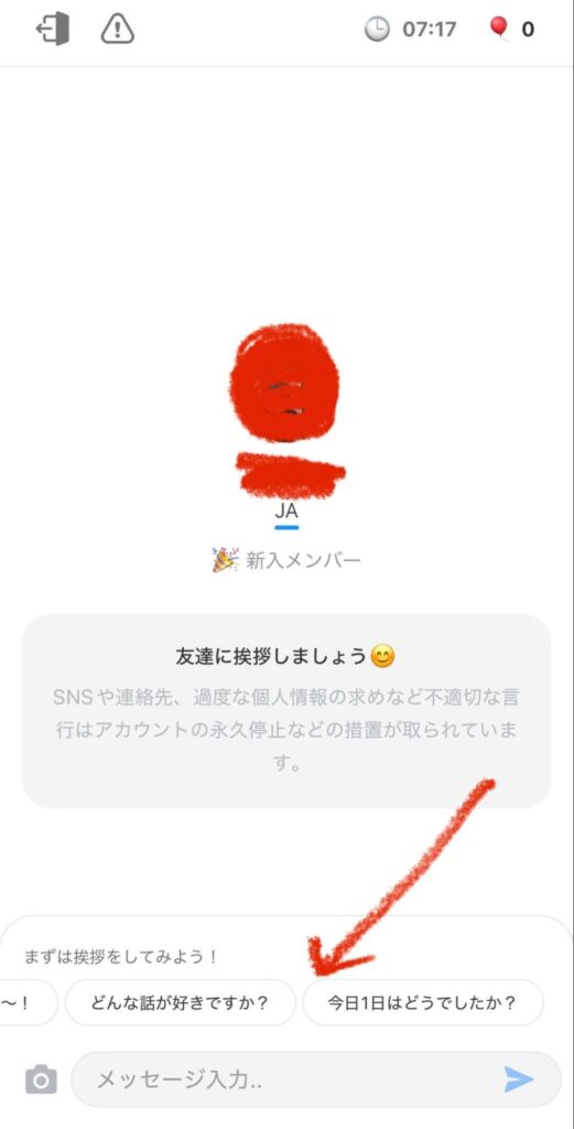右上の7分30秒という表示がメッセージのやり取りをしていない間も減っていきますので、チャットを楽しみたい方は積極的にメッセージを送ってみてください。