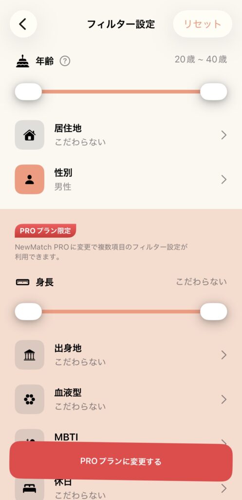 ただしNewMatchでは、ご自身の年齢±10歳の相手しか検索にかけることができません。10歳以上年齢が離れているユーザーはフィルター設定できないので注意しましょう。