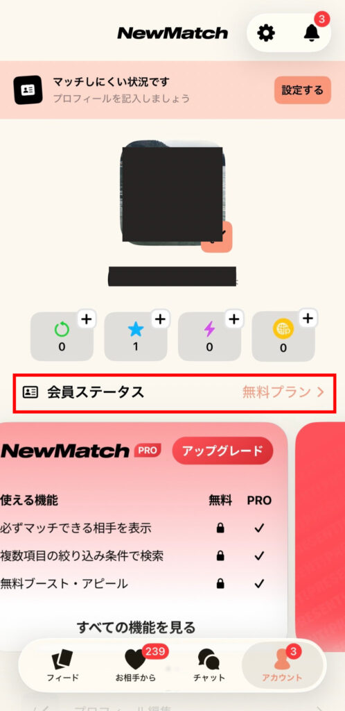①NewMatchのホーム画面右下「アカウント」をタップする