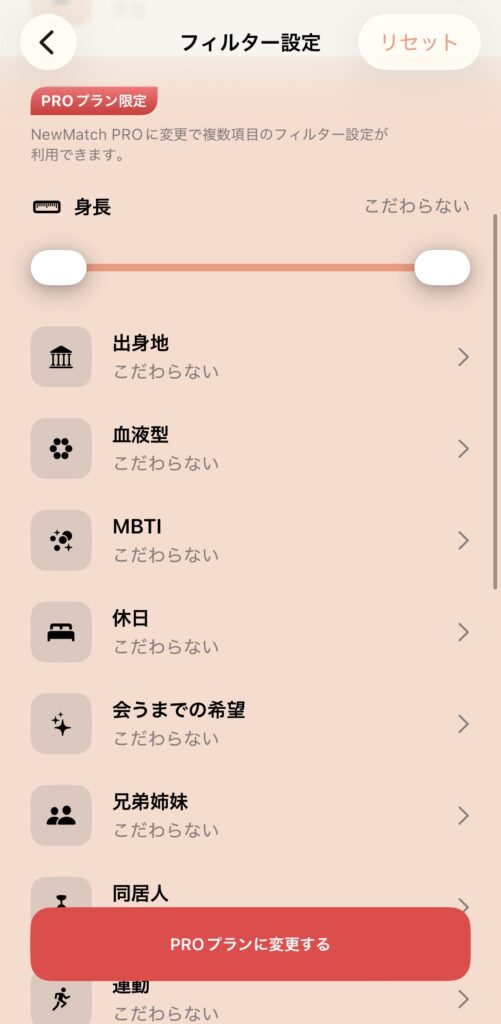 NewMatchのフリープランとPROでは、プロフィール検索の項目数が異なります。