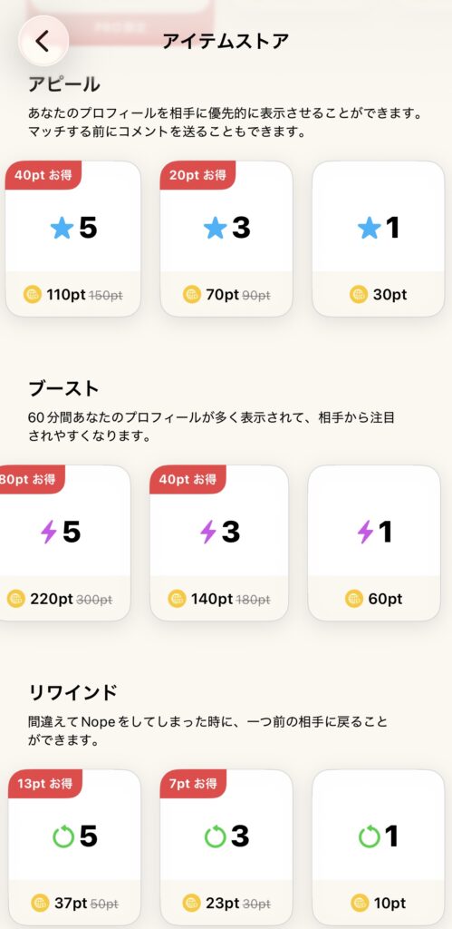 また後で詳しくご紹介しますが、フリープランの方がNewMatchの「ブースト」「アピール」「リワインド」機能を利用するには、別途で有料のポイントが必要です。