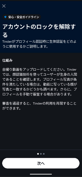 「最近行われたアクティビティにより、アカウントがロックされました。スワイプを再開するには、プロフィール写真を認証してください。」と表示され、プロフィールの認証が必要になってきます。