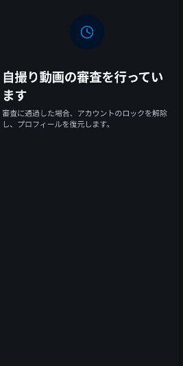 自撮り動画の撮影が終わると、「自撮り動画の審査を行っています。審査に通過した場合、アカウントのロックを解除し、プロフィールを表示します。」という画面が出てきます。